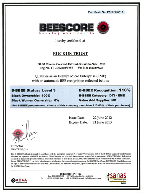 We are a fully black owned company subsequently rendering us 100% compliant to the Black Economic Empowerment initiative.Click below to view our BEE Certificate